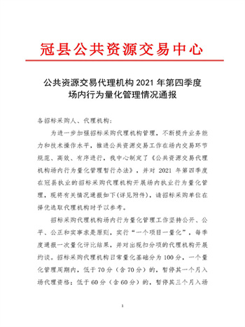 為進(jìn)一步加強(qiáng)招標(biāo)采購(gòu)代理機(jī)構(gòu)管理,不斷提升業(yè)務(wù)能力和技術(shù)操作水平,推進(jìn)公共資源交易工作在場(chǎng)內(nèi)交易環(huán)節(jié)規(guī)范、高效、有序進(jìn)行,冠縣公共資源交易中心制定了《公共資源交易代理機(jī)構(gòu)場(chǎng)內(nèi)行為量化管理暫行辦法》,并對(duì)2021年第四季度在冠縣執(zhí)業(yè)的招標(biāo)采購(gòu)代理機(jī)構(gòu)開展場(chǎng)內(nèi)執(zhí)業(yè)行為量化管理。