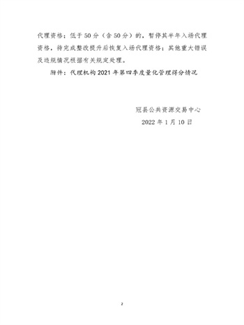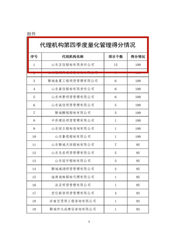 1月10日,冠縣公共資源交易中心對(duì)2021年第四季度在冠縣執(zhí)業(yè)的招標(biāo)采購(gòu)代理機(jī)構(gòu)場(chǎng)內(nèi)行為量化管理情況進(jìn)行通報(bào):山東正信招標(biāo)有限責(zé)任公司在本次量化考核中排名第一。