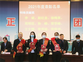 本次會議由集團黨支部書記周明臣主持,首先由集團副總趙紅龍同志宣讀表彰及相關文件,隨后集團副總徐海霞同志主持授獎活動,對2021年度功勛員工、貢獻獎、專業技術人才、先進單位、先進個人等各類受表彰人員、單位進行頒獎。