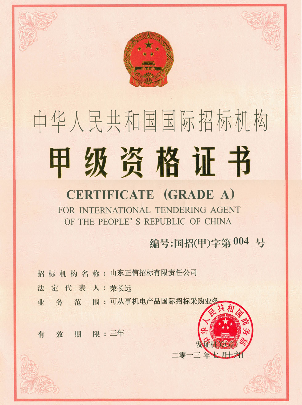 國(guó)際招標(biāo)機(jī)構(gòu)甲級(jí)資格證書